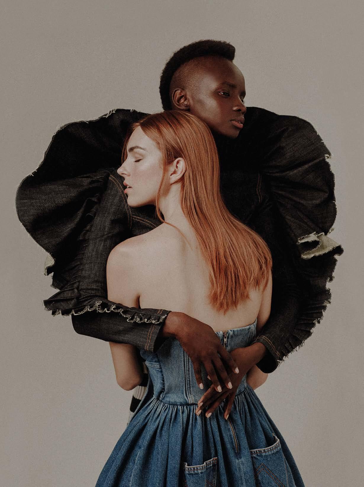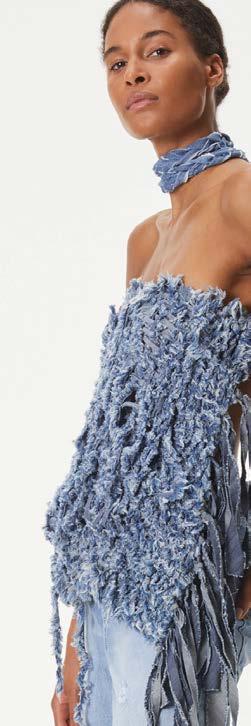 Le atmosfere oniriche, tradotte su tessuto dal designer, trasportano il denim in una dimensione che lo trasforma in qualcosa di unico. Denim jacket, camicie rodeo e cinque tasche flare vivono di inserti in tessuto jacquard floreale effetto punto croce, mentre ricami di paillettes impreziosiscono denim ballon e giubbotti crop, proiettandoci negli ‘80s.