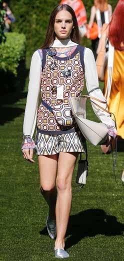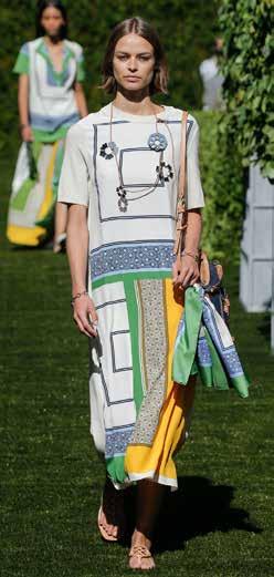 Helena Rubinstein, il gentleman dell’Essex ha influenzato un’intera generazione di colleghi. I suoi committenti erano i membri della media aristocrazia londinese e i grandi nomi emergenti della moda. Firmava tappeti, tessuti d’arredo, carte da parati che negli Anni ‘70 e ‘80 entravano con successo nelle ricche case americane. Fotografia, scultura, pittura, gioielli, collezioni di moda, David Hicks sembrava non aver tralasciato nulla, affrontando come ultima esperienza del suo cammino quella dell’architettura da giardino e di paesaggio. Ed è proprio da questo che Tory Burch prende spunto per la sua collezione. Si parla di stampe geometriche, in un mix di colori neutri o vibranti, studiati per un guardaroba fatto di pantaloni ampi, caftani e wrap-dress. Anche gli accessori non sono da meno: motivi geometrici per mule, tracolle giganti e perfino sui gioielli tra cui collane, orecchini e anelli con sigilli.