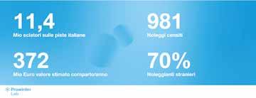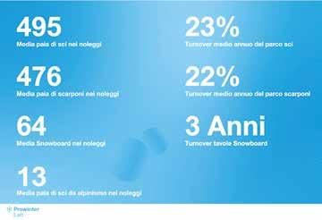 crescita con un totale di 11,4 milioni di sciatori sulle piste italiane, di cui 7,2 milioni sciatori nazionali e 4,2 milioni di stranieri. Il dato è stato fornito da Laurent Vanat International Report 2020. Secondo i dati della FESI a livello europeo, nella stagione 2018/2019 la vendita ai noleggi si è attestata al 60% del totale. Alla luce delle ricerche di Prowinter Lab si stima che, rispetto al totale di sciatori presenti in pista, il 44,8% utilizza un servizio rental. Questi numeri, se confrontati con una spesa media pro capite pari a 60 euro, generano un volume d’affari complessivo intorno alla realtà del noleggio pari a 372 milioni di euro. Il pubblico dei noleggianti è composto al 70% da stranieri che utilizzano questo servizio per motivi di trasporto e perché culturalmente più abituati alla realtà del rental.