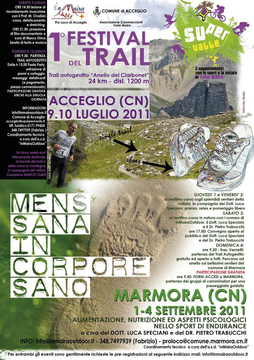 Si è da poco costituita una nuova associazione sportiva dilettantistica con sede a Cuneo, l’ASD InMairaOutdoor, che si occuperà di sport e turismo outdoor svolgendo principalmente le attività e gli eventi sportivi nella splendida cornice naturale della Valle Maira. Il primo appuntamento organizzato dalla nuova ASD si svolgerà il 9 e 10 luglio ad Acceglio (Alta valle Maira): il Festival del Trail. Si tratta di un trail autogestito di 24 km per un dislivello di 1200 mt lungo l’Anello del Ciarbonel, a cui parteciperà anche il runner Marco Olmo. Il secondo appuntamento di spessore è per i primi giorni di settembre, dall’1 al 4, quando avrà luogo a Marmora (CN) il “Mens sana in corpore sana”, rassegna dedicata all’alimentazione, alla nutrizione e agli aspetti psicologici negli sport endurance. In programma