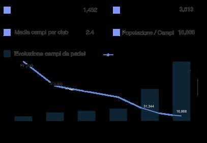 è considerato essere almeno cinque anni avanti, se non di più; quindi c’è ancora spazio per nuovi investimenti, anche perché in Italia, allo stato attuale, si contano ancora più giocatori di tennis che di padel. Un dato che colpisce è quello relativo al numero di praticanti per campo, che riassume lo spazio di crescita che ci sarebbe in un dato Paese. In Spagna nel 2021 c’era un campo ogni 3.385 giocatori, mentre in Svezia uno ogni 2.966. E in Italia? Uno ogni 16.868 giocatori. Dunque, è facile capire come siamo ancora decisamente lontani dalla satura zione di campi.