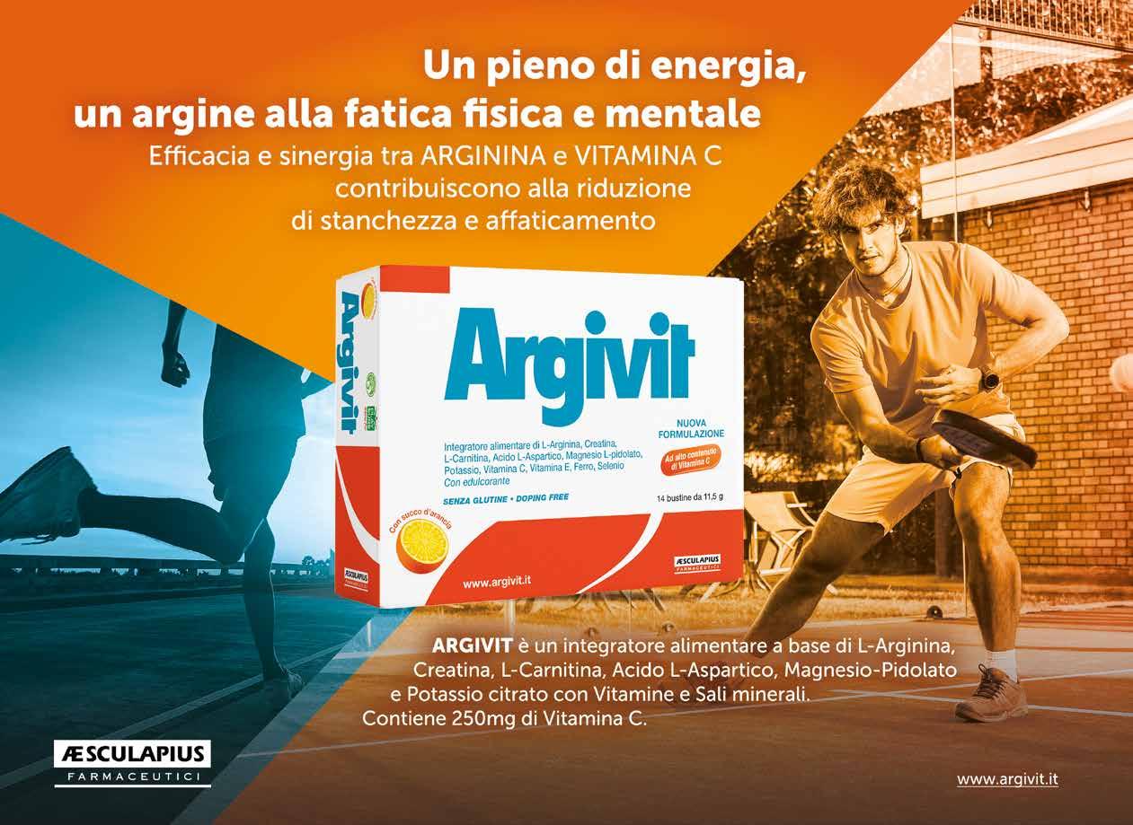 fonte per rigenerare ATP durante i primi secondi della contrazione muscolare. La presenza in Argivit di Magnesio pidolato e Potassio citrato previene, inoltre, l’insor genza di crampi durante l’attività e contrasta stanchezza e affati camento. Una bustina di Argivit contiene ben 250mg di Vitamina C, fondamentale per il manteni mento della normale funzione del sistema immunitario, durante e dopo un intenso esercizio fisico e per contrastare lo stress ossida tivo. Completano il “team” vincen te dei componenti Argivit l’acido L-Aspartico, la Vitamina E, il Ferro e il Selenio. Argivit è disponibile nella confezione da 14 bustine (si trova in farmacia e parafarmacia). È gluten free, privo di lattosio e di aspartame e contiene vero succo di arancia.