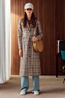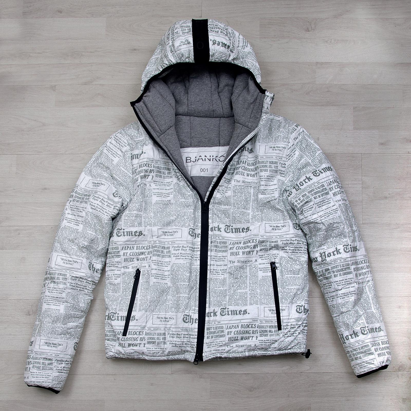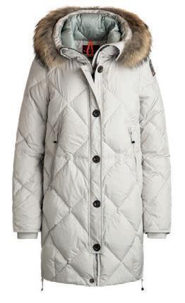 Il brand propone un cappotto in leggero poplin di poliestere con trattamento idrorepellente e imbottito in piuma. Due tasche sul davanti. Cerniera a doppio cursore coperta da patta con bottoni. Spacchi zippati. Vestibilità a ovetto. Patch PJS sulla manica sinistra. La pelliccia è in Finnish Asiatic Raccon, origine: Finlandia. La piuma ha un valore di fill power” pari a 700. La zip principale è fornita da YKK.