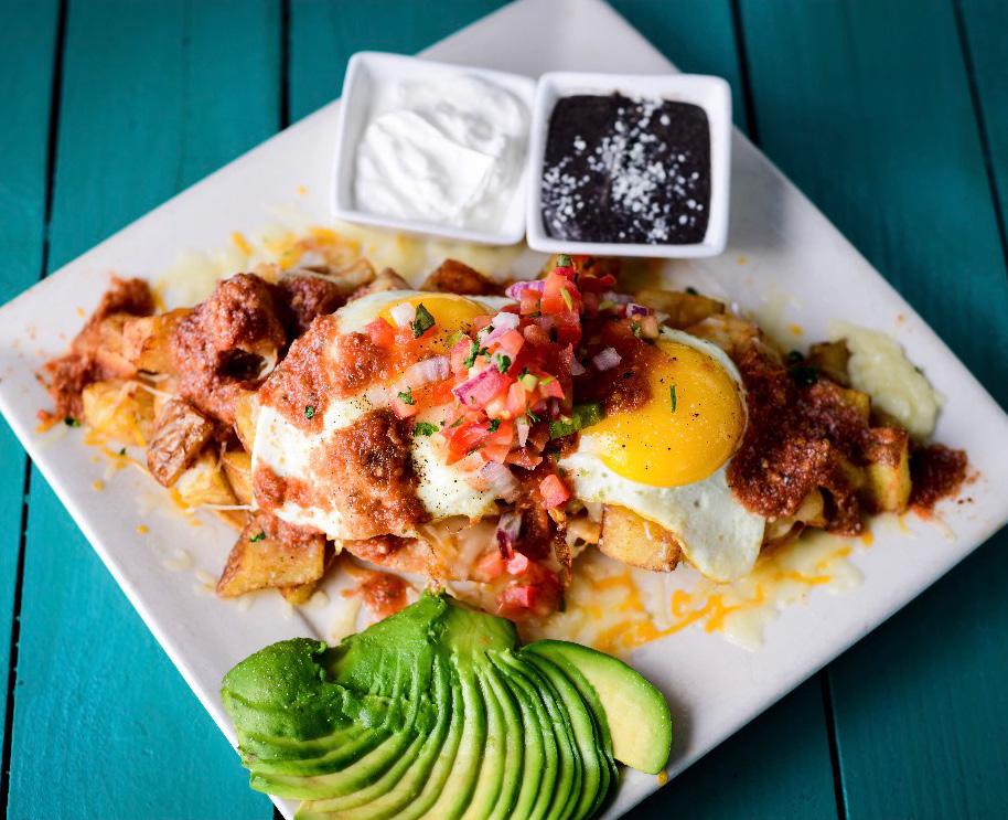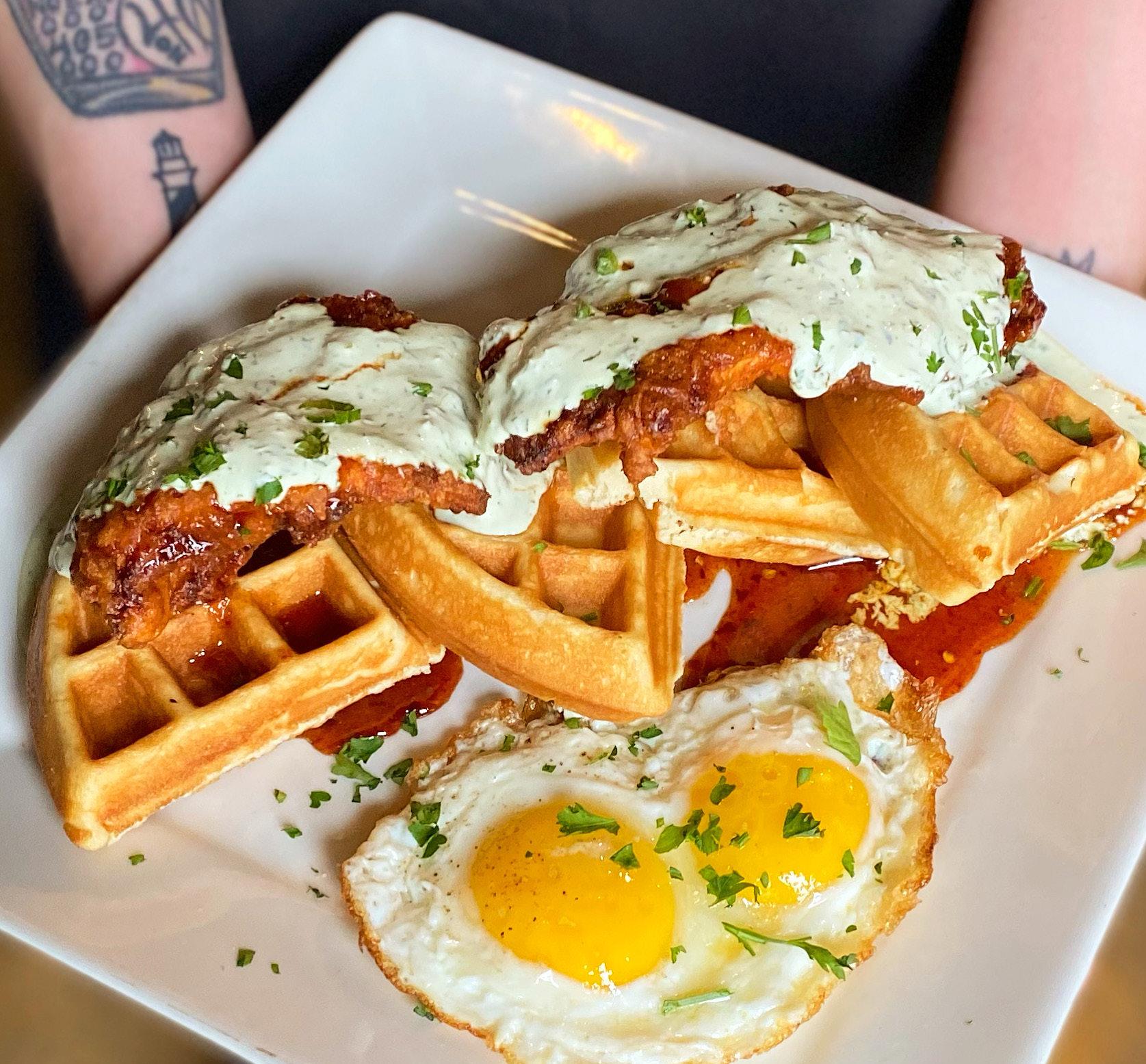 Scratch Kitchen & Cocktails’ General manager Grace Ivy describes their concept as “simple yet laborious” which lends itself to big flavors. They have a limited weekday brunch menu with fresh dishes made in-house from local ingredients, available from 11 a.m. to 3 p.m., but they roll out a full lineup on Saturdays and Sundays. Their most popular dishes are The Ranch Hand, a take on huevos rancheros, and the chicken and waffles, drizzled with hot honey and paired with a housemade herbed ranch dressing. Ivy recommends adding on a coffee old fashioned made with muscovado sugar syrup or a mimosa.