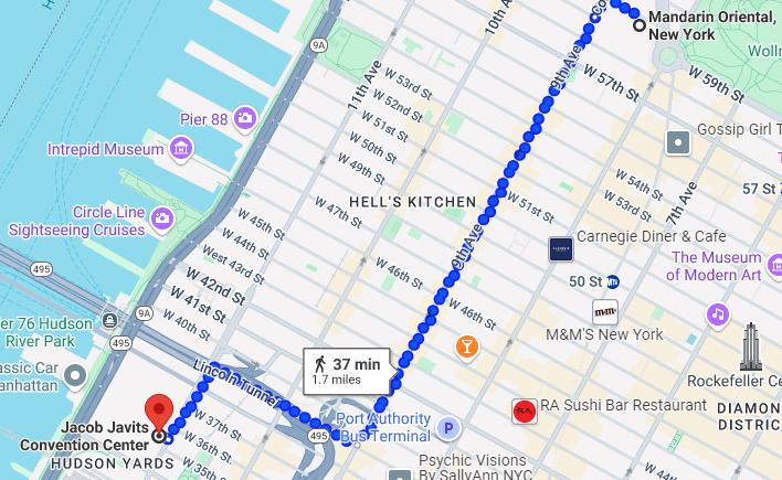 Le Javits Center se trouve à environ 37 minutes à pied du Mandarin. Il existe plusieurs options d'itinéraire grâce au système de quadrillage des rues, par exemple :