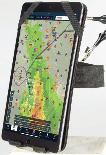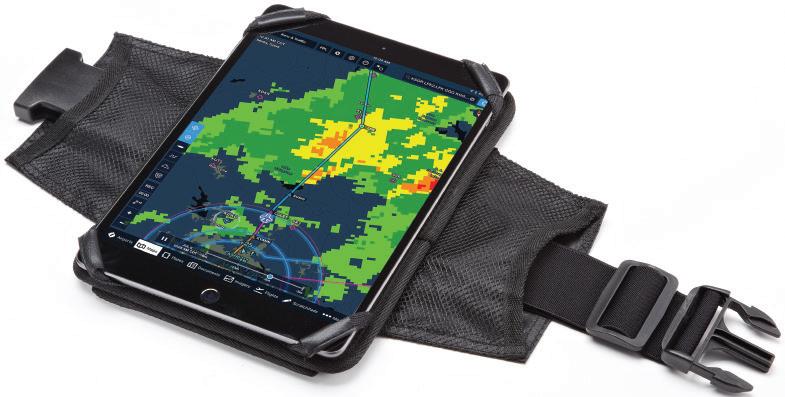 Flight Gear iPad Bi-Fold Kneeboard The Flight Gear iPad Bi-Fold Kneeboard holds the iPad right where you need it — secure on your leg but easily within reach. The innovative metal bracket will work with almost all cases. An integrated kickstand means you can tilt the iPad towards you, which helps to reduce glare. A simple hook-and-loop rotation mechanism allows for portrait or landscape viewing. The side flap is covered with soft material for attaching any of Sporty’s Flight Gear Gear Mods. Two sizes available. Mini Bi-Fold Kneeboard fits iPad Minis 1-6 and some other 8" size tablets. The iPad Bi-Fold Kneeboards fits 9.7" to 11" iPads.