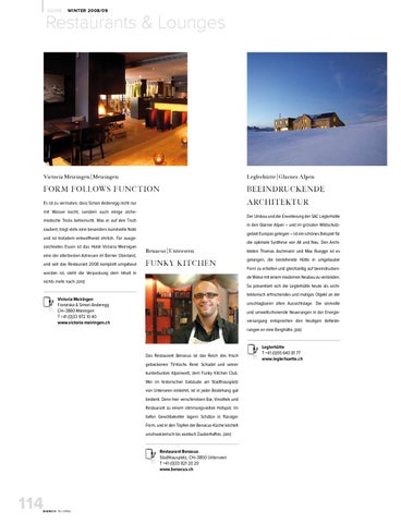 Das Restaurant Benacus ist das Reich des frisch gebackenen TV-Kochs René Schudel und seiner kunterbunten Alpenwelt, dem Funky Kitchen Club. Wer im historischen Gebäude am Stadthausplatz von Unterseen einkehrt, ist in jeder Beziehung gut bedient. Denn hier verschmelzen Bar, Vinothek und Restaurant zu einem stimmungsvollen Hotspot. Im tiefen Gewölbekeller lagern Schätze in flüssiger Form, und in den Töpfen der Benacus-Küche köchelt urschweizerisch bis exotisch Zauberhaftes. (am) Restaurant Benacus Stadthausplatz, CH–3800 Unterseen T +41 (0)33 821 20 20 www.benacus.ch