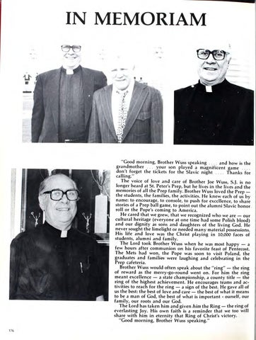 "G ood m orn in g, B roth er W uss speaking . . . . and how is the grandm other your son played a m ag n ificen t game d on 't forget the tickets for the S lav ic n ig h t T h an k s for ca llin g ." T h e voice o f love and care o f B roth er Joe W uss, S .J. is no longer heard at St. P eter's Prep, but he lives in the lives and the m em ories of all the Prep fam ily . B roth er W uss loved the Prep — the students, the fam ilies, the activities. H e knew each o f us by nam e: to encourage, to console, to push for excellen ce, to share stories of a Prep b all gam e, to poin t out the alu m n i S lav ic honor, roll or the Pope's com in g to A m erica. H e cared th at we grew, th at we recognized w ho we are — our cu ltu ral heritage (ev eryo n e at on e tim e had some Polish blood) and our d ig n ity as sons and daughters of the liv in g God. He n ev er sought the lim elig h t or needed m an y m aterial possessions. H is life and love was th e C hrist p layin g in 10,000 faces of students, alu m n i and fam ily. T h e Lord took B ro th er W uss w hen he was most happy — a few hours after com m u nion on his fav orite feast of Pentecost. T h e M ets had w on, th e Pope was soon to visit Poland, the graduates and fa m ilie s'w e re lau ghing and celebratin g in the Prep cafeteria. B ro th er W uss would o ften speak about the " r in g " — the ring o f reward as the m erry-go-rou nd w ent on. For him the ring m eant ex cellen ce — a state ch am p ion sh ip , a cou n ty title — the rin g of the highest ach iev em en t. H e encourages teams and ac tiv ities to reach fo r the rin g — a sign of the best. H e gave all of us th e best: th e best of love and care — the best of w hat it means to be a m an o f God, the best of w hat is im portant - ourself, our fam ily , our roots and our God. T h e Lord has tak en him and given him the R in g — the ring of ev erlastin g Jo y . H is ow n fa ith is a rem inder that we too will share w ith h im in e te rn ity th at R in g o f C hrist's victory. "G ood m orn in g , B ro th er W uss sp eak in g ."