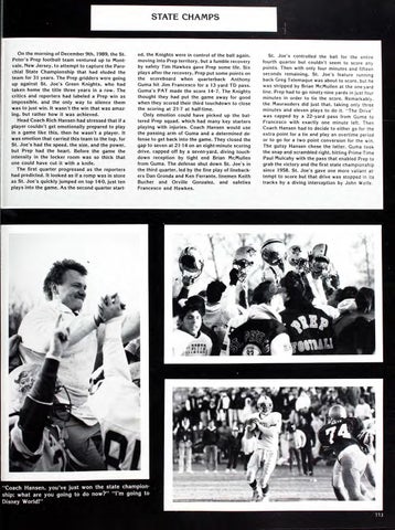 On the m orning o f D ecem ber 9th, 1989, the St. P eter’s Prep footb all team ventured up to Montvale, N ew J ersey, to attem pt to capture the Paro chial S tate Cham pionship that had eluded the team for 31 years. T h e Prep gridders w ere going up against St. J o e ’s Green K nights, w ho had taken hom e the title three yea rs in a row . The critics and reporters had labeled a Prep win as im possible, and the on ly w ay to silence them was to just win. it w asn ’t the win that w as am az ing, but rather how it w as achieved. Head C oach Rich Hansen had stressed that if a player couldn’t g e t em otion a lly prepared to play in a g am e like this, then he w asn’t a player. It w as em otion that carried this team to the top, for St. J o e ’ s had the speed, the size, and the power, but Prep had the heart. B efore the g a m e the intensity in the lock er room w as so thick that one could have cut it w ith a knife. T h e first quarter progressed a s the reporters had predicted. It look ed as if a rom p w as in store as St. J o e ’s quickly ju m ped on top 14-0, just ten plays into the gam e. A s the second quarter start