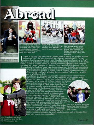 T t ’s safe to say that Prep functions as a second home to most if not all of its students, I and in April 2007, the school provided warm-hearted hospitality to 25 German JL students. For the past twenty-two years, Clara-Fey Gymnasium has served as Prep's sister school in its bi-annual German Exchange. The Exchange commenced in the spring when 25 German students arrived at Grand & Warren to experience what American life is like. Mr. James DeAngelo '85 and Ms. Curry coordinated life in America for the German Exchange Students, going great lengths to provide a delightful and entertaining cultural experience to ooth German and American students. Besides accompany ing their American partners to classes, German students experienced American life by visiting Ellis island, attending day trips to New York, and an overnight /isit to Washington, D.C. Nevertheless, the Exchange would not be complete without a trip to the for eign country. At the end of July, Mr. DeAngelo and Mr. Grusneski, newlyippointed G erm an T each er and participant of the 2 0 0 1 ^ ^ ^ G e rm a n Exchange, led a group of 23 Prep students to Germany three-week excursion began with a week-long stay at the Canisius College in Berlin. Their visit to the country’s capital included visits to the Brandeburg Gate, the Bundestag, the Reichstagsgebaude, in other words, the White House of Germany, and the n of the Berlin Wall. The Prep group then traveled four hours across the country by train to reunite A dth their exchange partners in Schleiden. Due \ % n i r r m tfL , _o an early departure by Mr. DeAngelo, two new \ CofeL J members- Mr. Anthony Keating and his son William- \ ■ ■ L / oined the Prep group to finish their time in Germany. N. Throughout their visit, students had tested their German skills through multiple situations .^nging fr°m a McTjernan SenjorsJake Junior Bryan McTiernan, Seniors Jake simple family dinner, attending.classes only spoken B|icharz Peter Drummond, and Sean n German, water-skiing in the fcirrel Kegion, order- Maguire examine the city map of menuiy Ber|in Germany, mg a meal at McDonald's, and tying; in a friendly ey team. In match of basketball with the Clara-Fey up traveled addition to life in Schleiden, the group traveled to to cities such as Cologne, Trier, onn, and a mini-trip to Amsterdam.