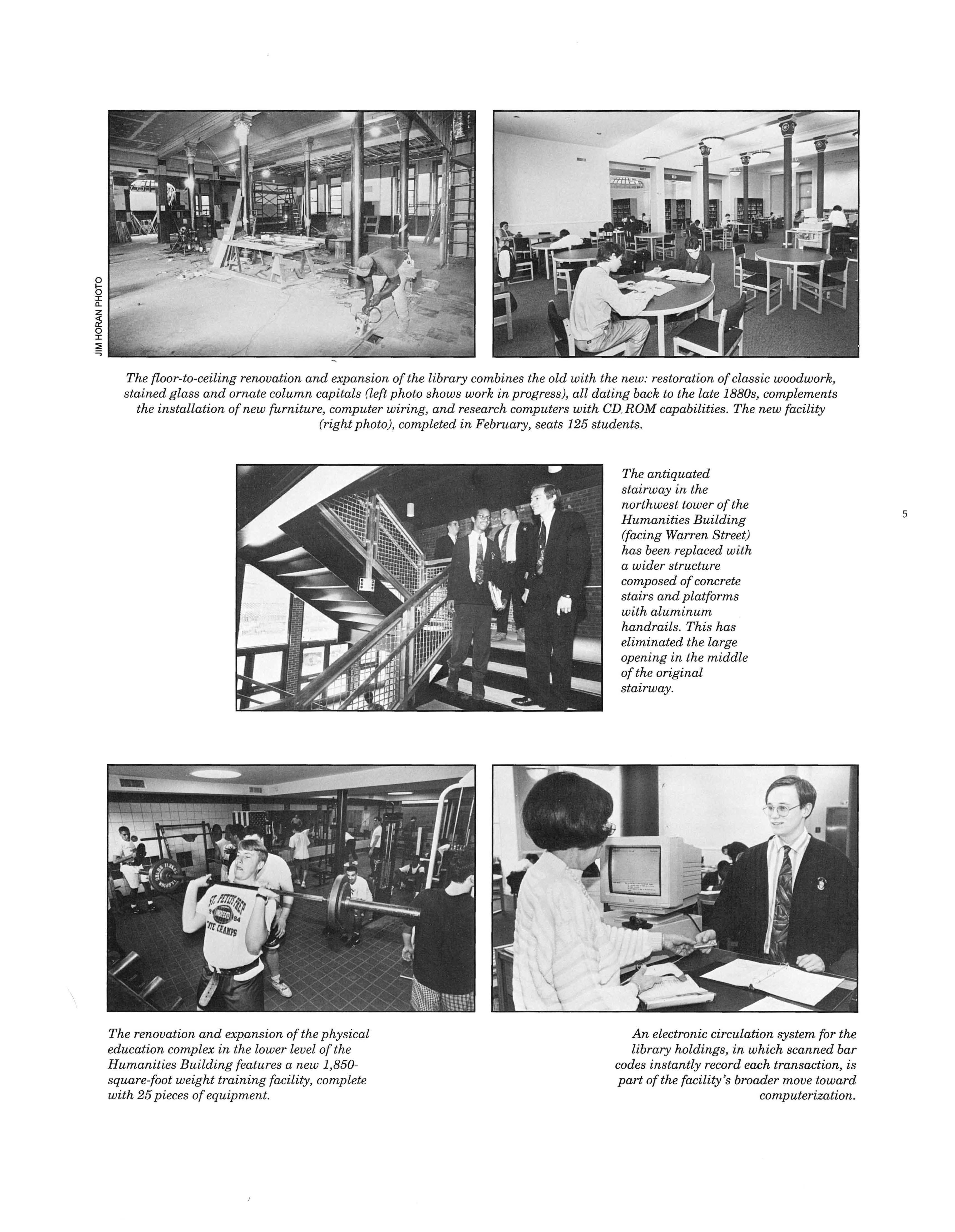 Phase One renovations will continue this summer with the installation of a CD ROM computer network in the library, and the first in a series of renovations to the gymnasium, including an upgrade of the lighting, sound system and scoreboard. Renovations in the summer of '96 will focus on the west side of the campus, as well as further projects in the gymnasium.