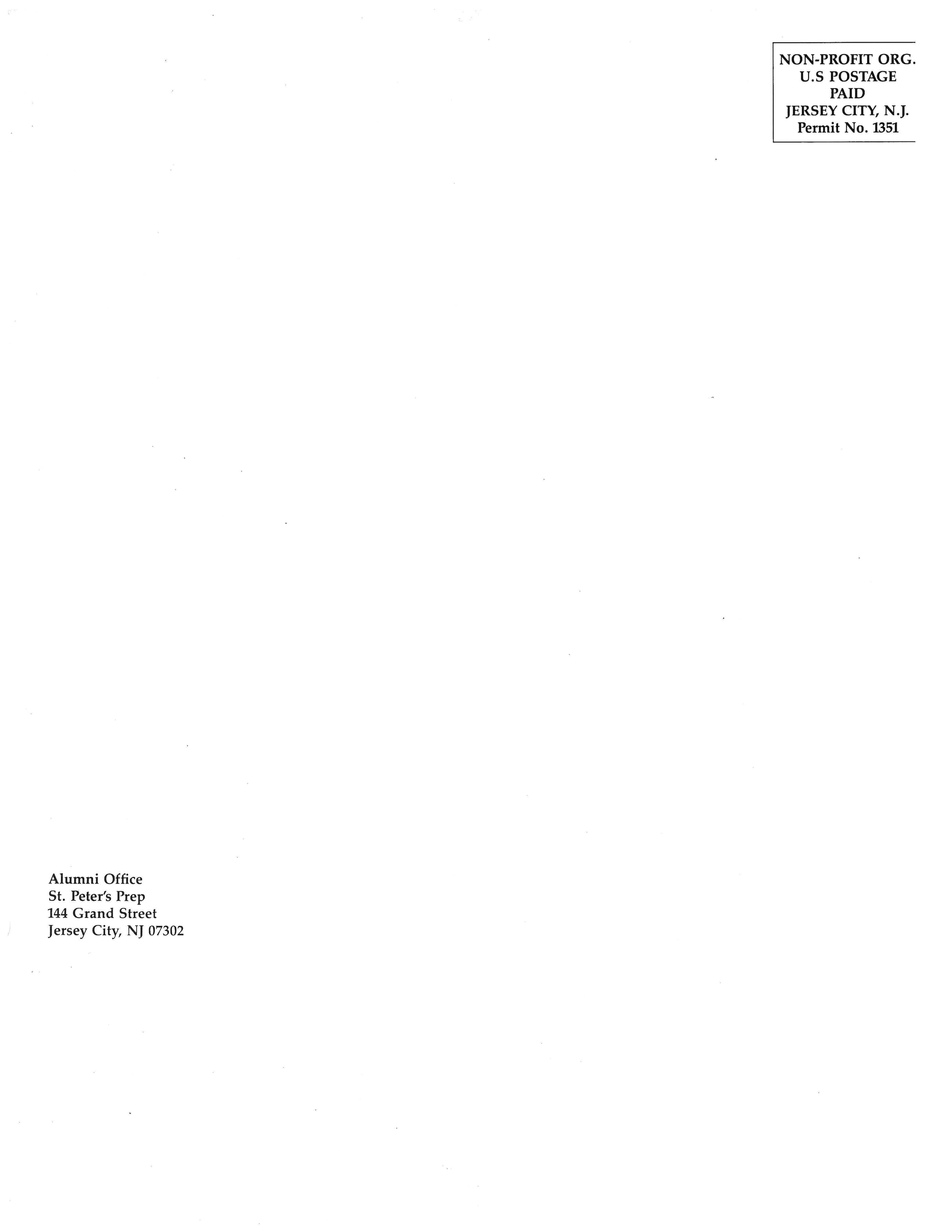 Prep Magazine is published by the Office of Public Information, St. Peter's Preparatory School, Jersey City, NJ, and is distributed free of charge to Prep alumni, faculty, staff and parents The Office, directed by Raymond Hennessey, is located in Mulry Hall, 144 Grand Street, Jersey City, NJ, 07302. Telephone: (201) 547-6420.