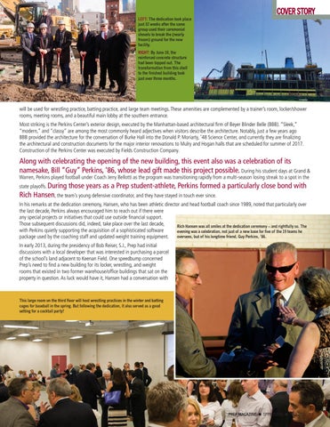 Rich Hansen, the team’s young defensive coordinator, and they have stayed in touch ever since. In his remarks at the dedication ceremony, Hansen, who has been athletic director and head football coach since 1989, noted that particularly over the last decade, Perkins always encouraged him to reach out if there were any special projects or initiatives that could use outside financial support. Those subsequent discussions did, indeed, take place over the last decade, Rich Hansen was all smiles at the dedication ceremony – and rightfully so. The with Perkins quietly supporting the acquisition of a sophisticated software evening was a celebration, not just of a new base for five of the 19 teams he oversees, but of his longtime friend, Guy Perkins, ’86. package used by the coaching staff and updated weight training equipment. In early 2013, during the presidency of Bob Reiser, S.J., Prep had initial discussions with a local developer that was interested in purchasing a parcel of the school’s land adjacent to Keenan Field. One speedbump concerned Prep’s need to find a new building for its locker, wrestling, and weight rooms that existed in two former warehouse/office buildings that sat on the property in question. As luck would have it, Hansen had a conversation with