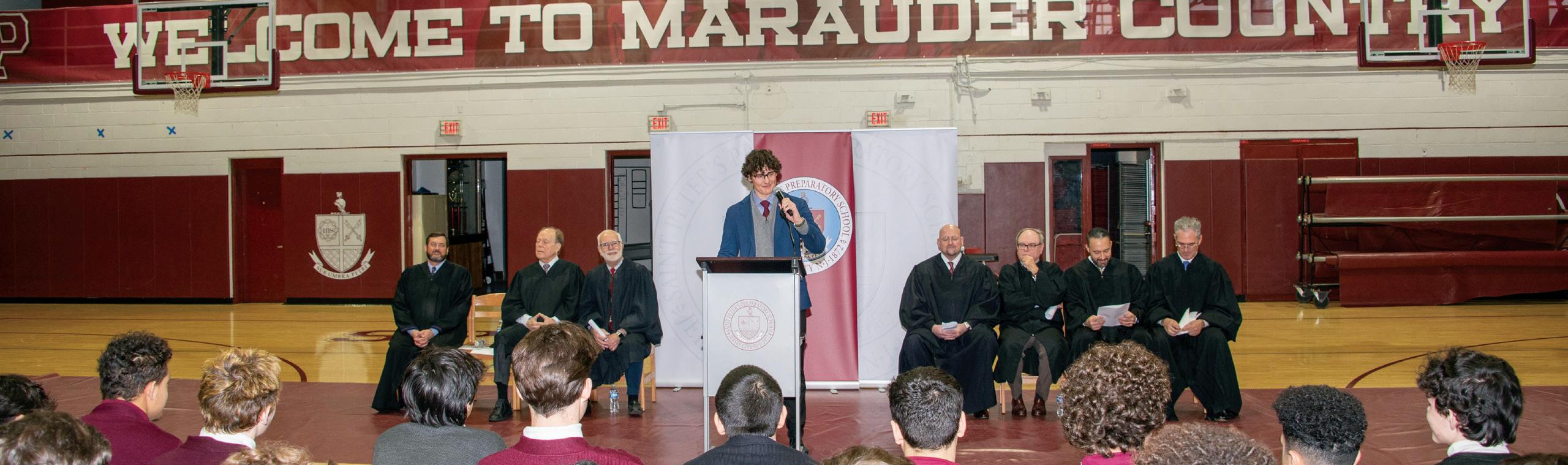 As a follow-up to February’s Career Day (see page 22), a panel of seven alumni serving as judges in Hudson County met with freshmen and seniors in the gym for a panel discussion. Topics included their paths from Prep to the legal profession and ultimately to the bench, as well as significant influences and lessons from their Prep years. Some common themes emerged from the judges’ stories: an interest in public service and commitment to good citizenship that took shape in the Prep classroom; a desire to act as a man for others seeking justice and the common good; and the Prep brotherhood that has shaped their relationships with mentors and colleagues throughout their careers. Special thanks to and in particular to Judge Jablonski along with Eli Jablonski, ’23 for their assistance in planning the assembly.