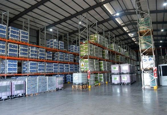 Зберігання сировини Потужність зберігання сировини становить 510 місць на виробничому складі. На додаток до позицій важливо відзначити, що в резервуарах ми маємо ємність для зберігання 140 000 літрів сипучих рідин. Це дозволяє не лише автоматизувати подачу деяких матеріалів до реакторів, а й збільшити ємність зберігання сировини.