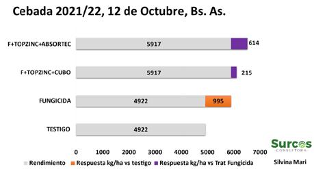 Rendimento de cevada (kg/ha) após uma aplicação de fungicida + 4 l/ha de Absortec Copper. Ensaio realizado em French (9 de Julio, Bs. As.) pela Surcos Consultora (Eng. Silvina Mari) em 2021/2022.