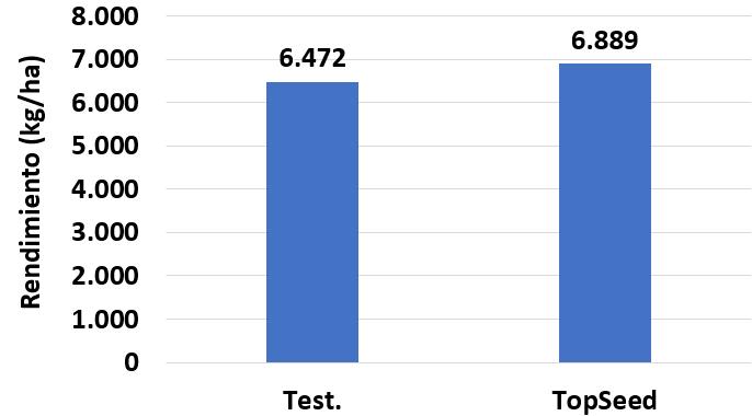 Na Figura 1, é mostrado o rendimento do milho. A aplicação do TopSeed como tratamento de sementes aumentou o rendimento do milho em 418 kg/ ha. Mesmo com um estresse hídrico severo durante a safra, a resposta foi significativa.