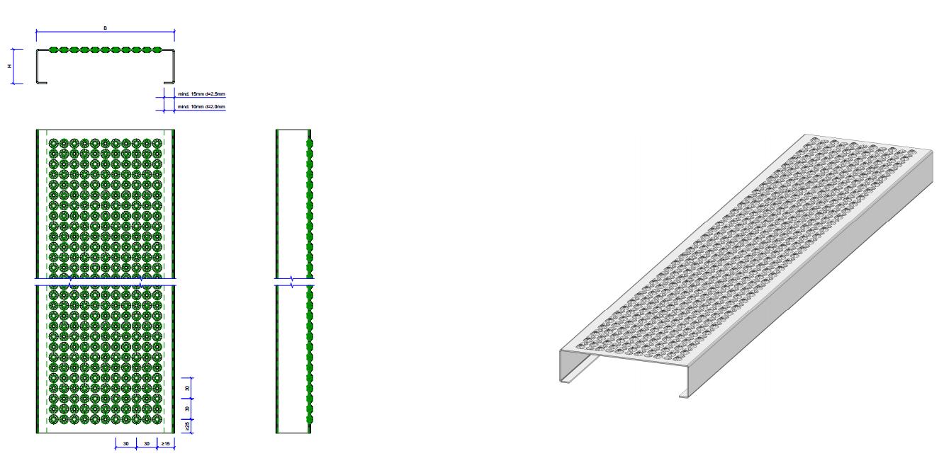 Wenn an Profilroste Seitenbacken angeschweisst werden, kann das Produkt als Treppenstufe eingesetzt werden. Damit können komplette Treppenanlagen erstellt werden. Die Bohrungen an den Seitenbacken erfolgen nach Standard oder in Absprache mit dem Kunden.