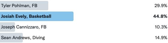 Josiah Evely won the Springfield Student Men’s Athlete of the Week with 44.8 percent of the vote. The first-year forward for the men’s bas ketball team went 7-for-10 from the field to gather 20 points in the Pride’s 76-72 win over Lehman on Saturday.