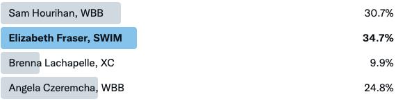 Elizabeth Fraser won a close race for the Springfield Student Women’s Athlete of the Week with 34.7 per cent of the vote. The senior swimmer came in first place in the 500 freestyle with a time of 5:22.24, and had two third-place finishes in the 200 indi vidual medley and 200 freestyle in the Pride’s tri-meet on Saturday. Right behind her was Sam Houri han with 30.7 percent in the poll. The senior forward for the women’s bas ketball team combined for 54 points, 27 rebounds, six blocks, and five steals throughout the week, including 23 points and 10 rebounds in the Pride’s 58-53 win over Rowan on Saturday.