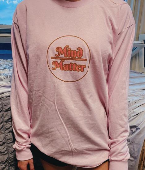 colors: tan, pink, and dark green. The front of each shirt displays the word “mind” with a horizontal line below it and the word “matter” under that – the mes sage being “mind over matter.” The back of the sweatshirt says — with one word on top of the other – “happy mind happy life.”