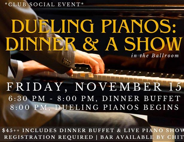 6:30-8:00 PM Dinner Buffet. 8:00 PM Dueling Pianos Show Begins. $45++ Registration Fee Includes Dinner Buffet and Live Piano Show. Bar Available by Chit. Registration Required.