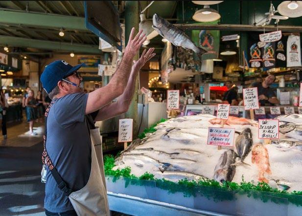 Seafood is a quintessential part of the Pacific Northwest, and we can’t talk seafood without thinking about Pike Place Market in downtown Seattle. You’ve probably heard about the famous fish-throwing tradition at Pike Place; it’s a popular tourist attraction, as well as a draw for sustainability-minded locals, and a prime example of the vibrant atmosphere. Turbot, halibut, and salmon are the main fish tossed through the air from vendor to customer. The image of fresh Coho salmon from the Columbia River Valley being thrown across the aisles inspires our fish course: pan-seared Coho salmon over sautéed asparagus and artichokes with a light white wine butter sauce.