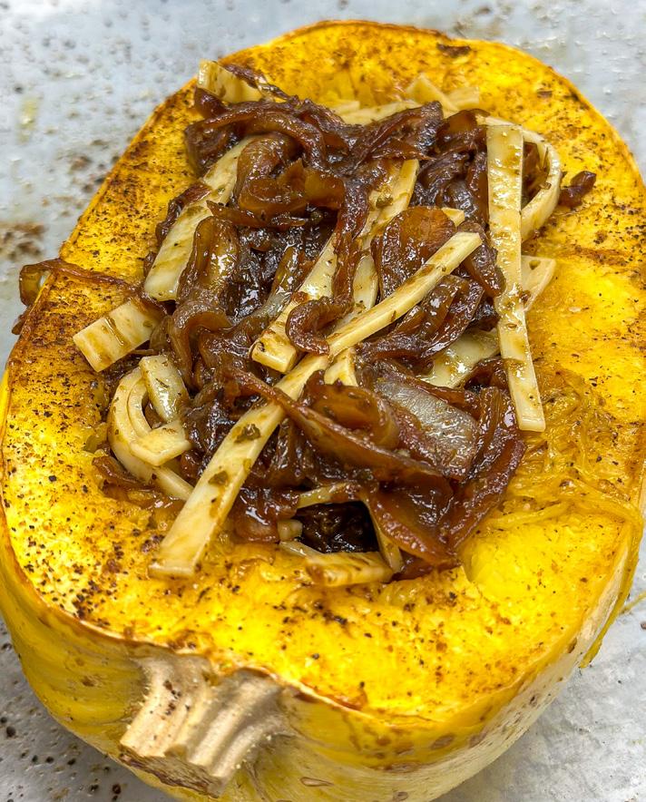 8. Fill the squash with the caramelized onions. Pro tip: I like to mix some chopped Swiss or Gruyere cheese into the caramelized onions for added flavor.