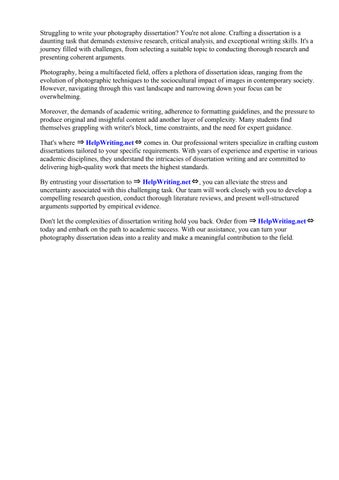 Don't let the complexities of dissertation writing hold you back. Order from ⇒ HelpWriting.net⇔ today and embark on the path to academic success. With our assistance, you can turn your photography dissertation ideas into a reality and make a meaningful contribution to the field.
