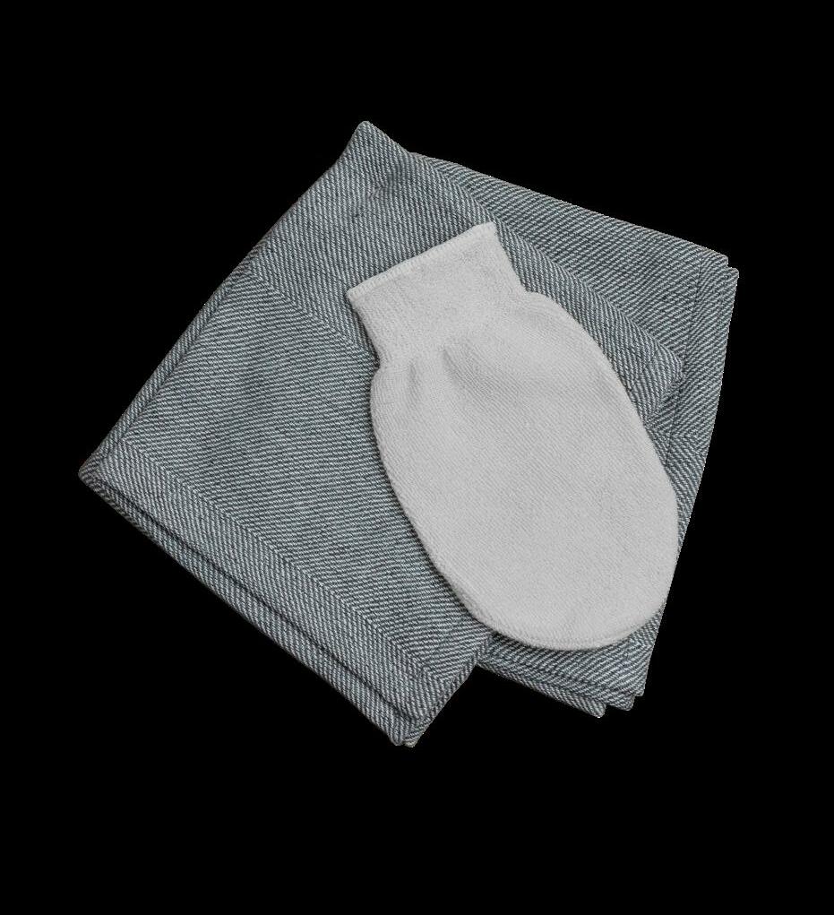 Tee saunahetkestä vielä nautinnollisempi! Kaksi ihanan tyylikästä ja pehmeää pellavaista laudeliinaa, sekä yhteensopiva pesukinnas, jolla puhdistat ihon pehmeästi.