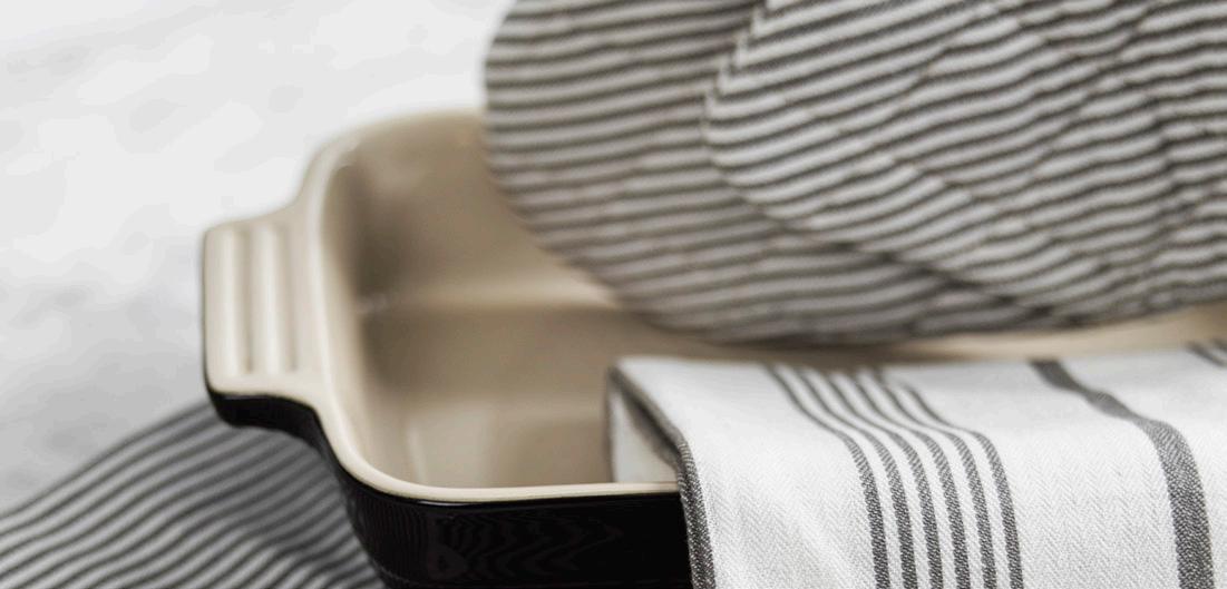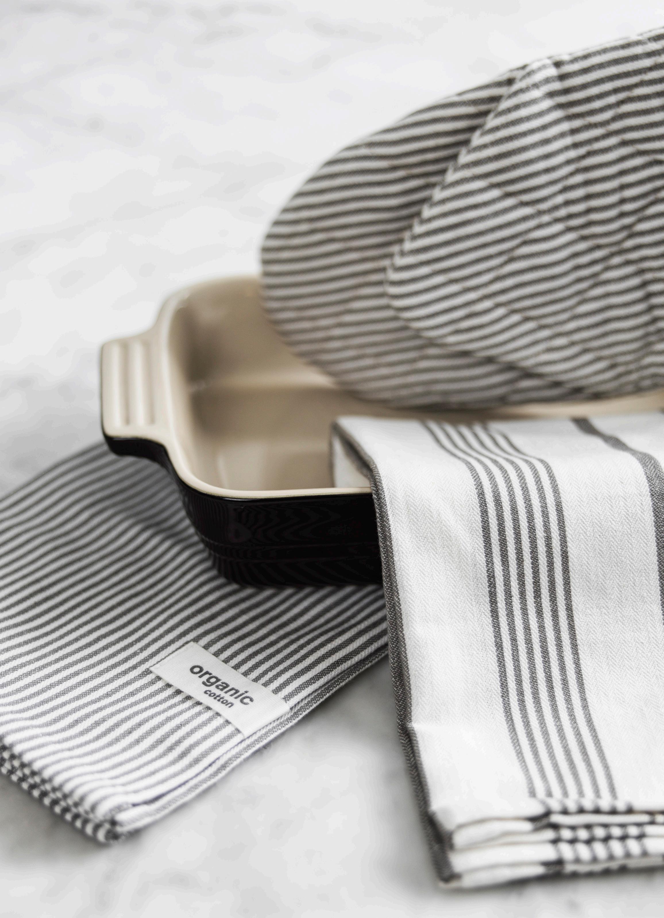 Uudista keittiötäsi setillä, joka sisältää kaksi tyylikästä keittiöpyyhettä (50x70 cm) sekä yhteensopivan patakintaan, kaikki 100% luomupuuvillaa.