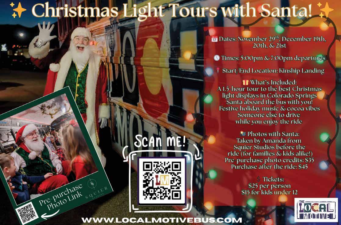 The holiday season in Colorado Springs just got brighter with the return of The Local Motive Christmas Light Tour. Known for their creative, communitydriven events, The Local Motive is transforming their party bus into a festive sleigh-on-wheels for a magical evening of holiday cheer. Riders will enjoy a dazzling guided tour of the city’s best holiday light displays, including a special trip through the world-famous Broadmoor neighborhood, renowned for its breathtaking decorations and glowing holiday spirit.