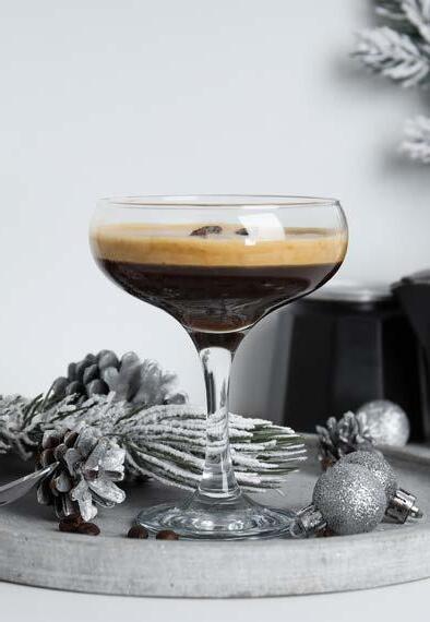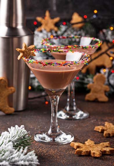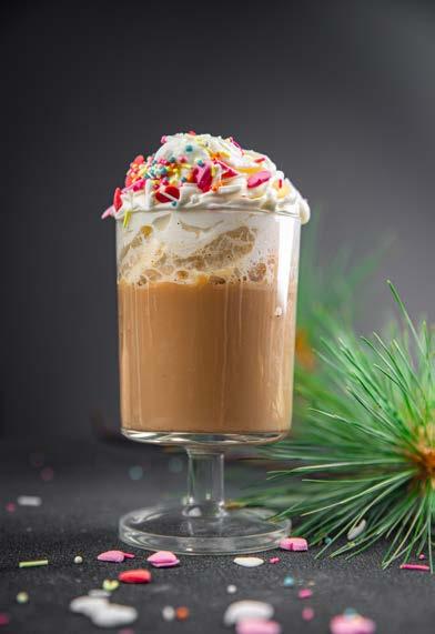 4 cl. Råstoff Coffee Liqueur, fyld op med kakaomælk. Pynt med flødeskum, små skumfiduser og festlig krymmel.