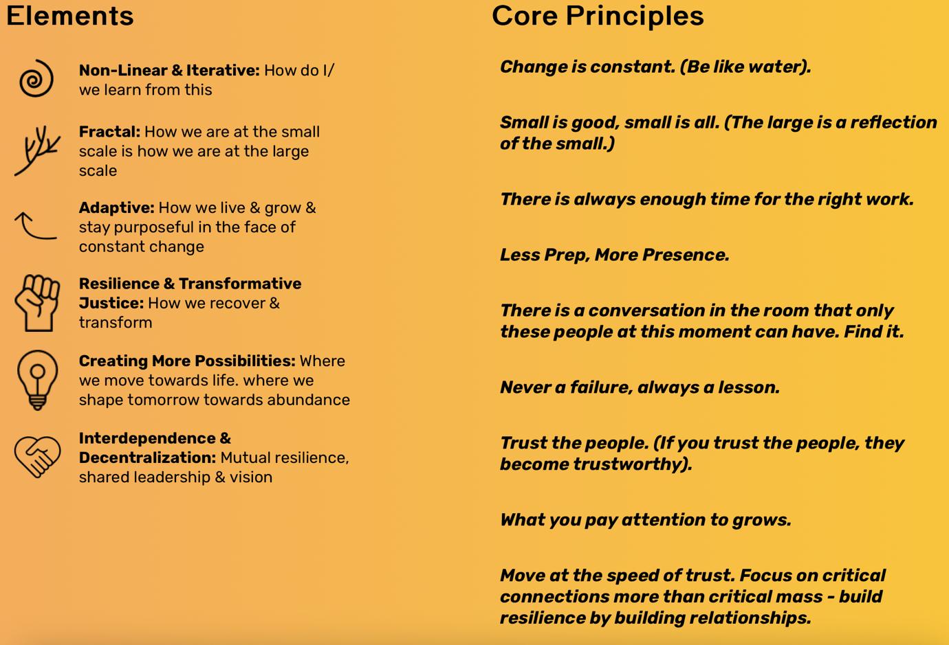 These statements help us stay grounded in the Emergent Strategy elements. The principles are related to each other and they lay inside of each other in a given moment. They show up as catch phrases when we want to center ourselves in a particular practice or element.