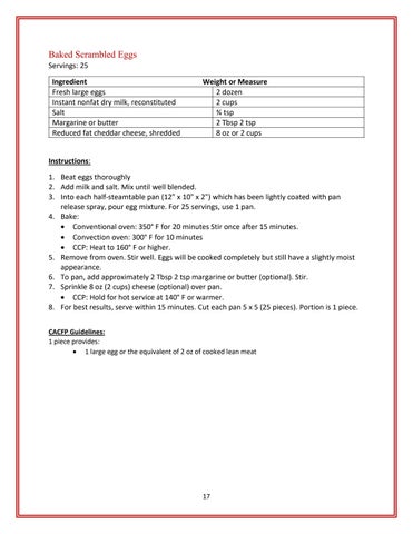 Instructions: 1. Beat eggs thoroughly 2. Add milk and salt. Mix until well blended. 3. Into each half-steamtable pan (12" x 10" x 2") which has been lightly coated with pan release spray, pour egg mixture. For 25 servings, use 1 pan. 4. Bake: • Conventional oven: 350° F for 20 minutes Stir once after 15 minutes. • Convection oven: 300° F for 10 minutes • CCP: Heat to 160° F or higher. 5. Remove from oven. Stir well. Eggs will be cooked completely but still have a slightly moist appearance. 6. To pan, add approximately 2 Tbsp 2 tsp margarine or butter (optional). Stir. 7. Sprinkle 8 oz (2 cups) cheese (optional) over pan. • CCP: Hold for hot service at 140° F or warmer. 8. For best results, serve within 15 minutes. Cut each pan 5 x 5 (25 pieces). Portion is 1 piece. CACFP Guidelines: 1 piece provides: • 1 large egg or the equivalent of 2 oz of cooked lean meat