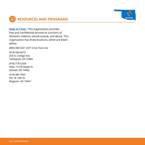 RESOURCES AND PROGRAMS Help In Crisis - This organization provides free and confidential services to survivors of domestic violence, sexual assault, and abuse. This organization has three locations, which are listed below. (800) 300-5321 24/7 Crisis Text Line (918) 456-0673 205 N. College Ave. Tahlequah, OK 74464 (918) 718-5330t Adair 110 W Maple St. Stillwell, OK 74960 (918) 485-7003 901 SE 10th St. Wagoner, OK 74467