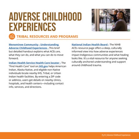 ADVERSE CHILDHOOD EXPERIENCES TRIBAL RESOURCES AND PROGRAMS Menominee Community - Understanding Adverse Childhood Experiences - This brief but detailed handout explains what ACEs are, what they can do, and what you can do to move forward. Indian Health Service Health Care locator - The “Find Health Care” tool on IHS.gov helps American Indian, Alaska Native, and eligible non‑Native individuals locate nearby IHS, Tribal, or Urban Indian health facilities. By entering a ZIP code or address, users get details on nearby clinics, hospitals, and health centers—including contact info, services, and directions.