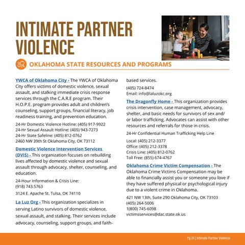 INTIMATE PARTNER VIOLENCE OKLAHOMA STATE RESOURCES AND PROGRAMS YWCA of Oklahoma City - The YWCA of Oklahoma City offers victims of domestic violence, sexual assault, and stalking immediate crisis response services through the C.A.R.E program. Their H.O.P.E. program provides adult and children’s counseling, support groups, financial literacy, job readiness training, and prevention education. 24-Hr Domestic Violence Hotline: (405) 917-9922 24-Hr Sexual Assault Hotline: (405) 943-7273 24-Hr State Safeline: (405) 812-0762 2460 NW 39th St Oklahoma City, OK 73112