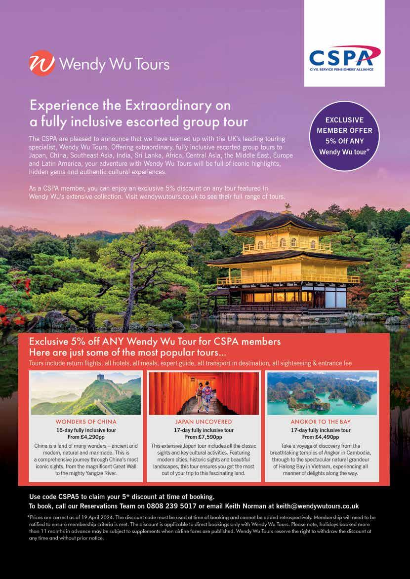 © 2024. The Pensioner magazine is published by Square7 Media Ltd on behalf of the Civil Service Pensioners’ Alliance (CSPA). All rights reserved. The CSPA and the publishers declare that any publication of any advertisement does not carry their endorsement or sponsorship of the advertiser or their products unless so indicated. Contributions are invited and, whether or not accepted, submissions will be returned only if accompanied by a stamped addressed envelope. No responsibility can be taken for drawings, photographs or literary contributions during transmission or while in the publisher’s hands. Proof of receipt is no guarantee of appearance. In the absence of an agreement, the copyright of all contributions, literary, photographic or artistic belongs to the CSPA. This publication (or any part thereof) may not be reproduced, transmitted or stored in print or electronic format (including, but not limited to, any online service, database or part of the internet), or in any other format in any media whatsoever, without the prior written permission of Square7 Media Ltd. The CSPA and Square7 Media accept no liability for the accuracy of the contents or any other opinions expressed herein. The views expressed in this magazine do not necessarily reflect the official views of the CSPA.