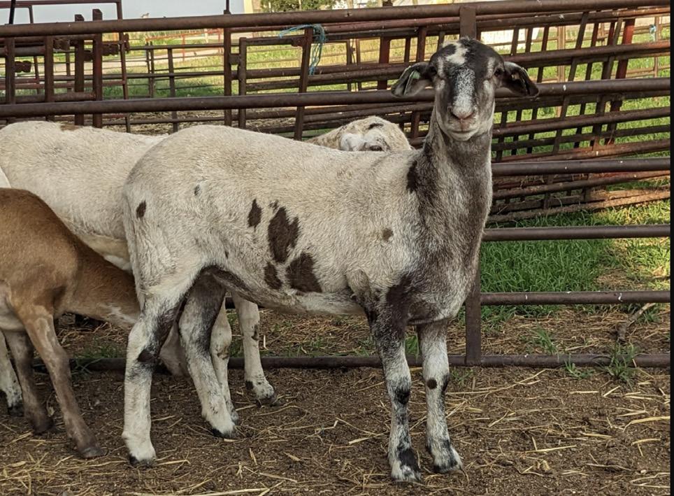 Black and white ewe. Daughter of “Calico Kat”