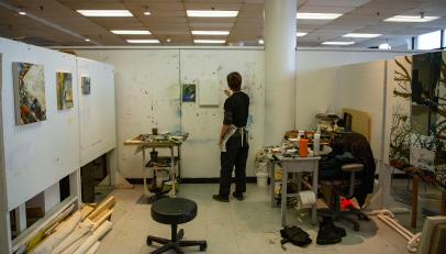 The exit sign that illuminates my hometown art studio at night represents the transition from high school to college. Because of this setting's familiarity change and the impremanence of such comfort are exhibited through this painting. I am “exiting” that part of my life to enter the next phase.