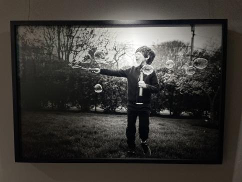 Similar to “Zen Xan,” Denise Laurinaitis’s collection, “The Missing Photographs,” captures outdoor images using a black and white lens. The photos show children blowing bubbles, on the beach, toying with a hose, running through a field, and playing with a model airplane. Though the scenes are simple, they demonstrate Laurinaitis’s eye for ambiguity. Hose Spray shows a garden hose moving in a snake-like manner while the girl to its left dances similarly. In Bubbles, a boy is framed by a bubble so that his eyes are erased from the image, though the rest of his face is centered.