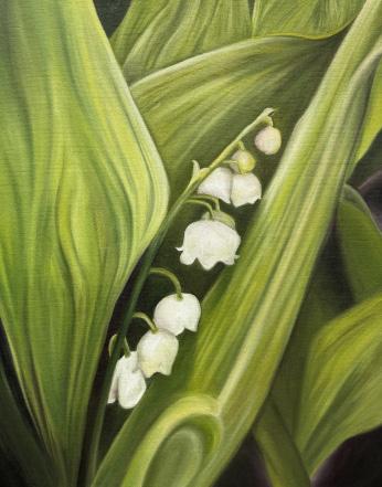 To paint the Lily of the Valley, I took inpiration from its form that represents the passage and cylical nature of time. These plants blossom in my front yard every spring. They depict the familiarity, comfort, and hope that spring provides us with. Every time I see these plants begin to blossom, I am filled with excitement about the months ahead.