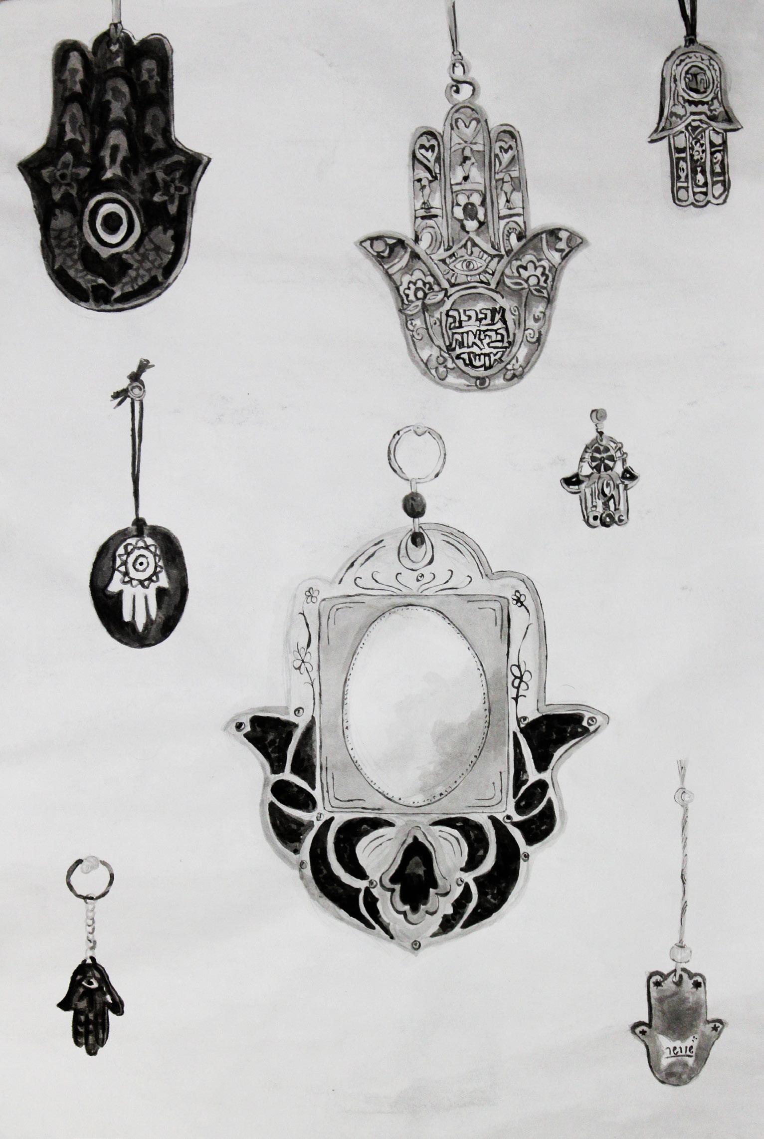This series, titled “Stains of Life,” utilizes ink as the medium to ‘stain’ the paper and preserve memories. My Mother’s Wall captures the memory of the Hamsa covered wall in my childhood home.