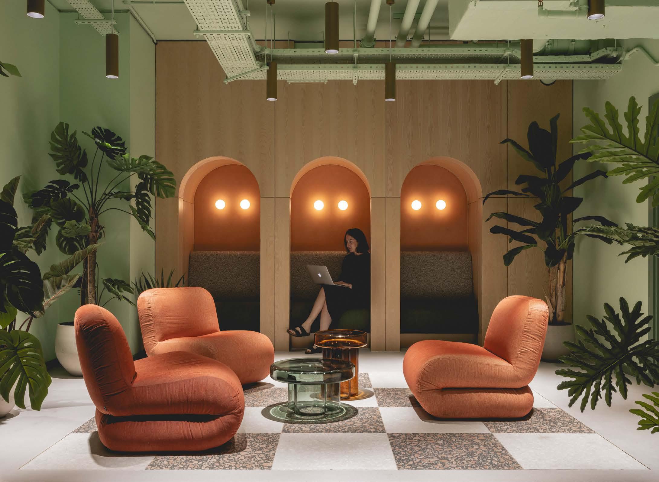 Communal cycling and wellness facilities embrace a playful, almost surreal aesthetic reminiscent of a modern reinterpretation of Alice in Wonderland, with arched seating inspired by architectural language of Devonshire Square and globe lights casting a warm glow against lime plaster walls. Plywood joinery and chequered terrazzo effect tiles contribute to the creation of a crafted, tactile ambiance.