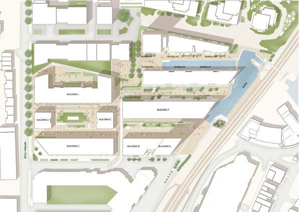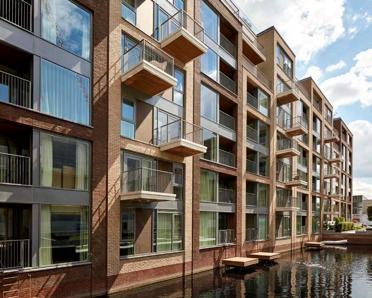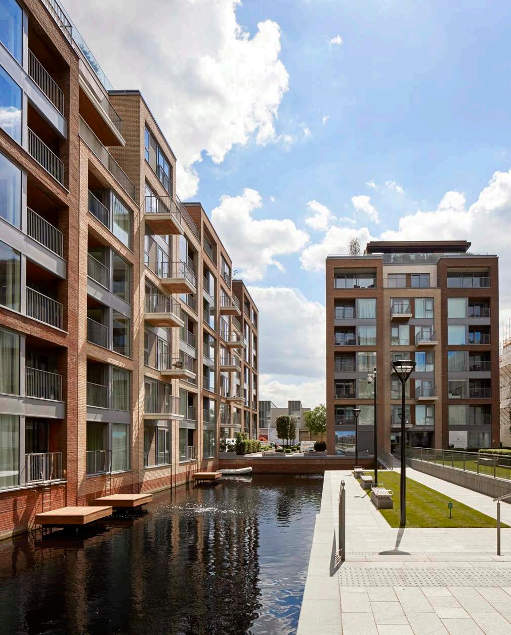A new waterfront community positions a series of dual aspect residential blocks along a series of reinstated canals, created by restoring an existing lock linked to the River Thames.