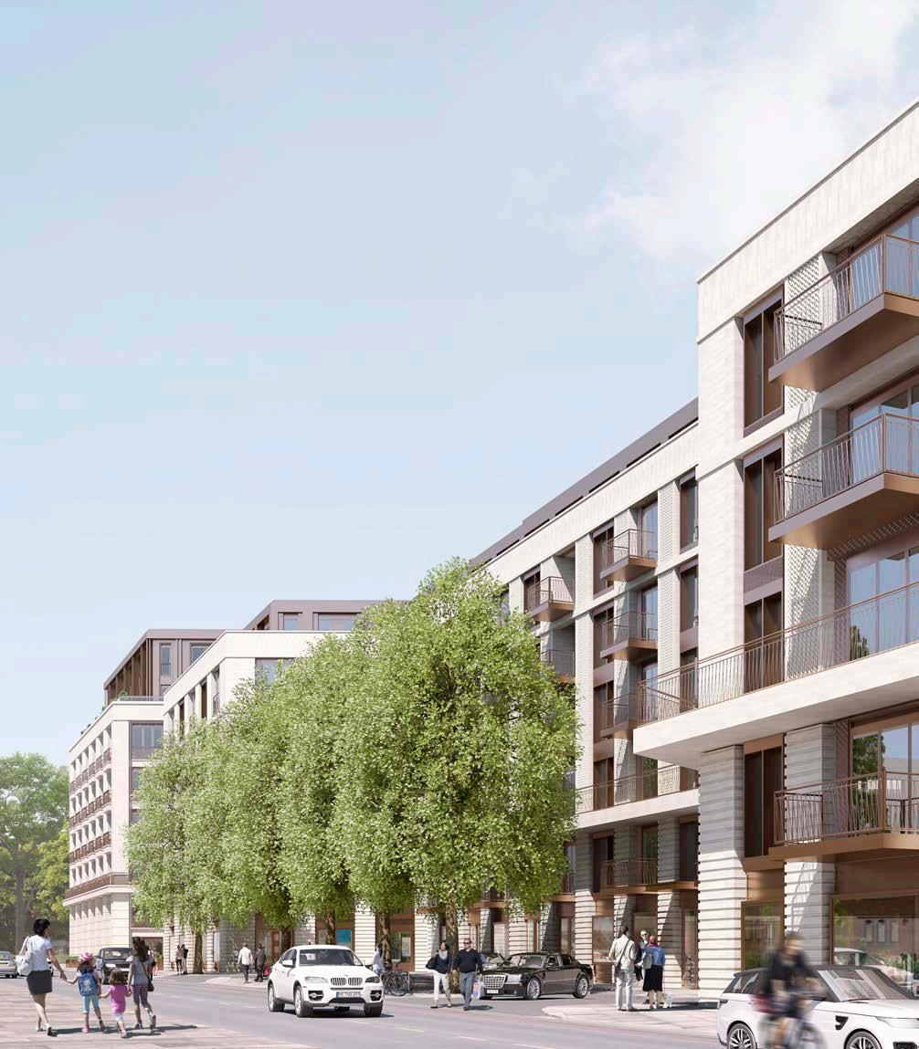 The ‘mansion blocks’ define the street, while the tower recognises the wider role of the site, creating a gateway into London from the west.