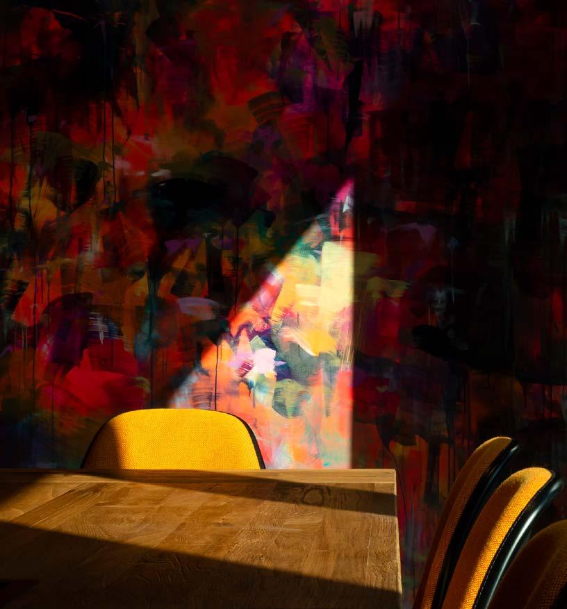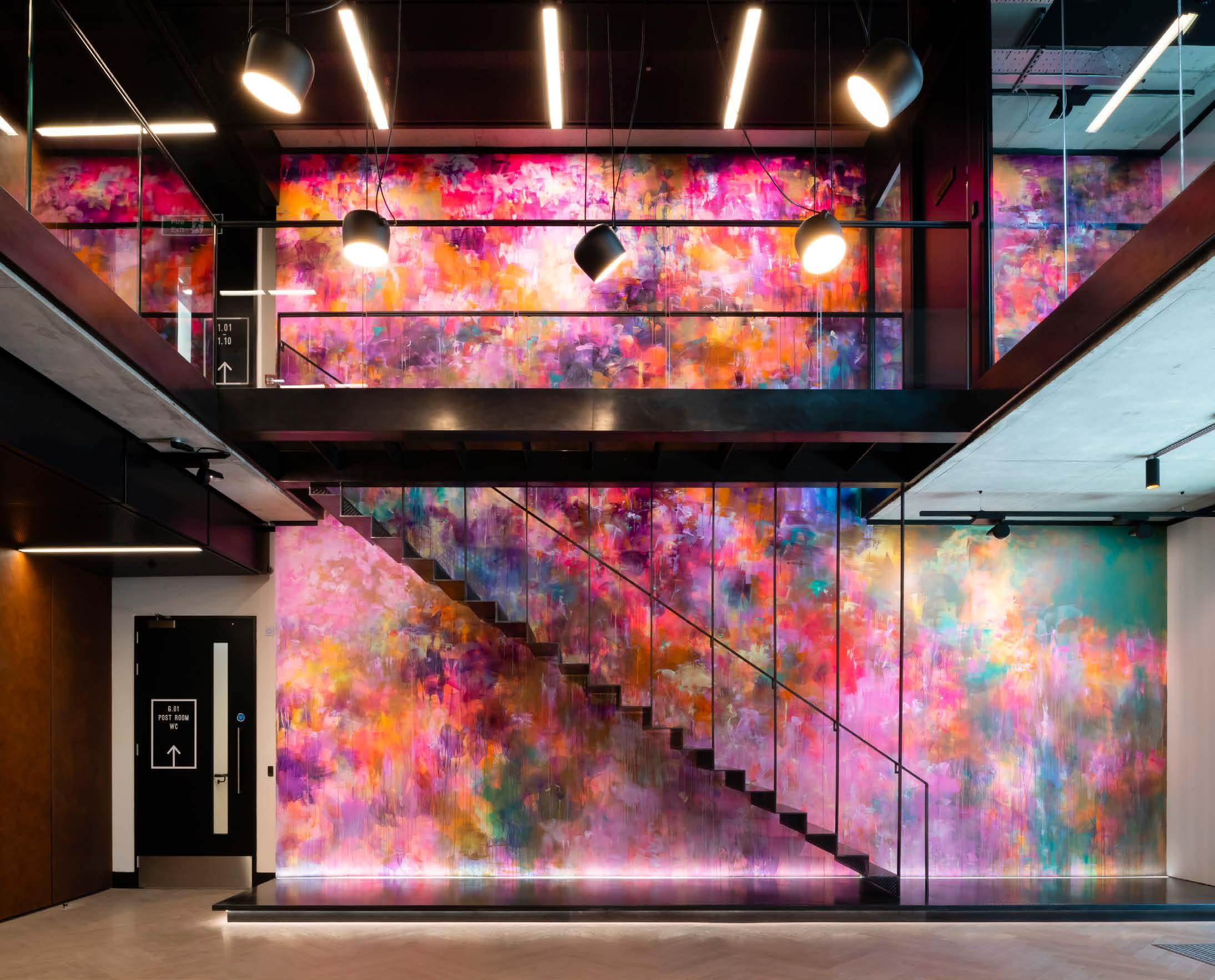 On entering the building, a striking mural by renowned street artist Mr. Jago establishes a vibrant colourscape for the main ground floor reception, and acts as a backdrop to a folded perforated metal staircase.