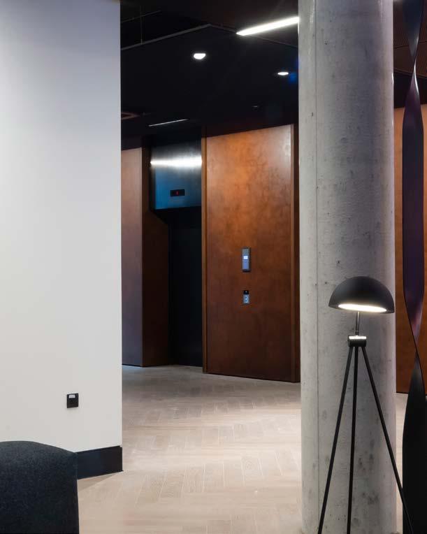 An open plan lounge for informal and social meetings is furnished with contemporary Scandinavian tables and seating, upholstered in grey or black textured fabrics with accents of orange and mustard to complement the artwork and the corten steel of the lift lobbies and exterior.