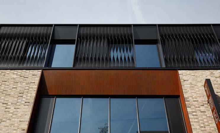 Influenced by the characteristic warehouse vernacular of the surrounding South Shoreditch Conservation Area, the building envelope employs a palette of brick, metal and glass. Following the curved line of Phipp Street with a series of brick columns punctuated by corten-clad window reveals, the design emphasises the vertical proportions of the structure.